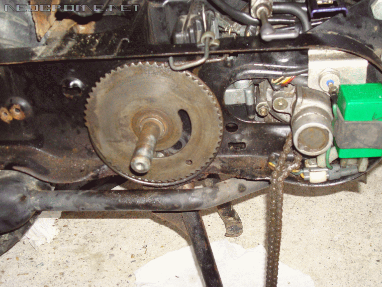 Je moet wel ff de kickstartveer loshalen voor je de as met tandwiel eruit tikt op de foto zit deze nog vast aan je achterbrug.