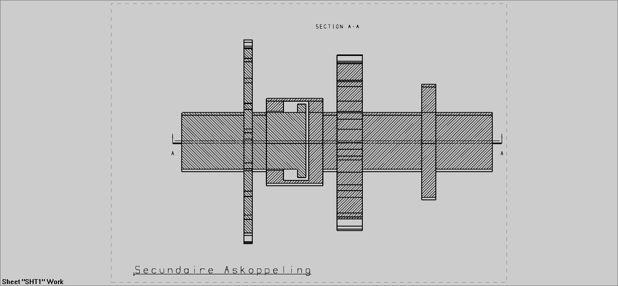 Ik heb mijn model alweer verbeterd en heb nog een extra stukje vernuft aangebracht in de secundaire as, zodat deze mee kan schuiven met het primaire tandwiel, en toch het aandrijvende tandwiel op één plek kan blijven. Het idee is een soort mini-koppeling op/in de primaire as zelf. Voor meer duidelijkheid, check deze technische tekening: