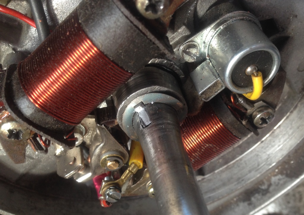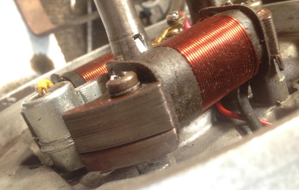 – De ontstekingsspoel is optisch goed. Wel is de kern van de ontstekingsspoel ooit wat aangelopen op het vliegwiel. Dat kan toch geen kwaad? Het vervangen van de bobine, boegie en boegiekabel helpt niet. De aarde is goed. Dus anders kan ik de zwakke vonk alleen nog maar verklaren met een slechte condensator.