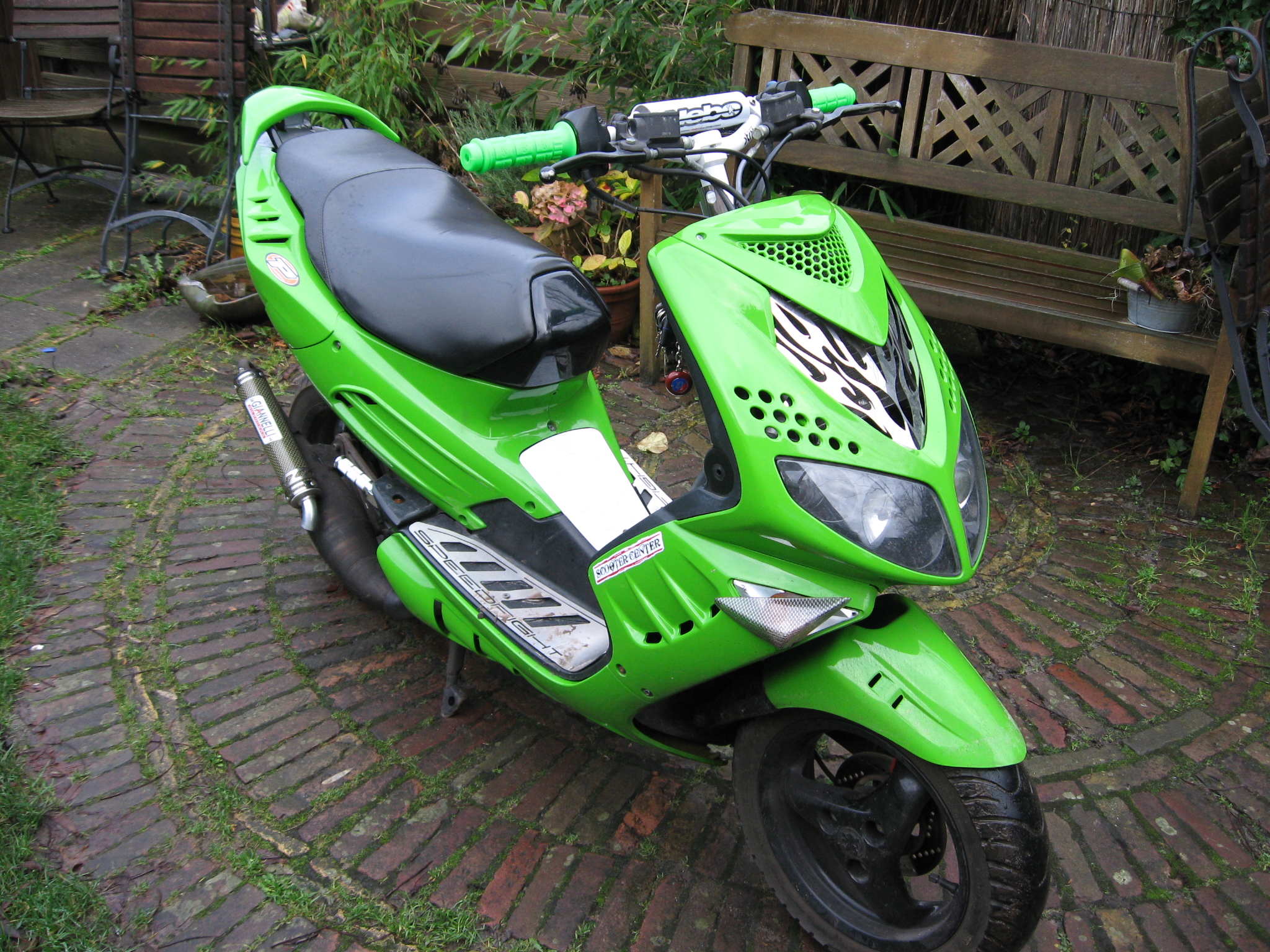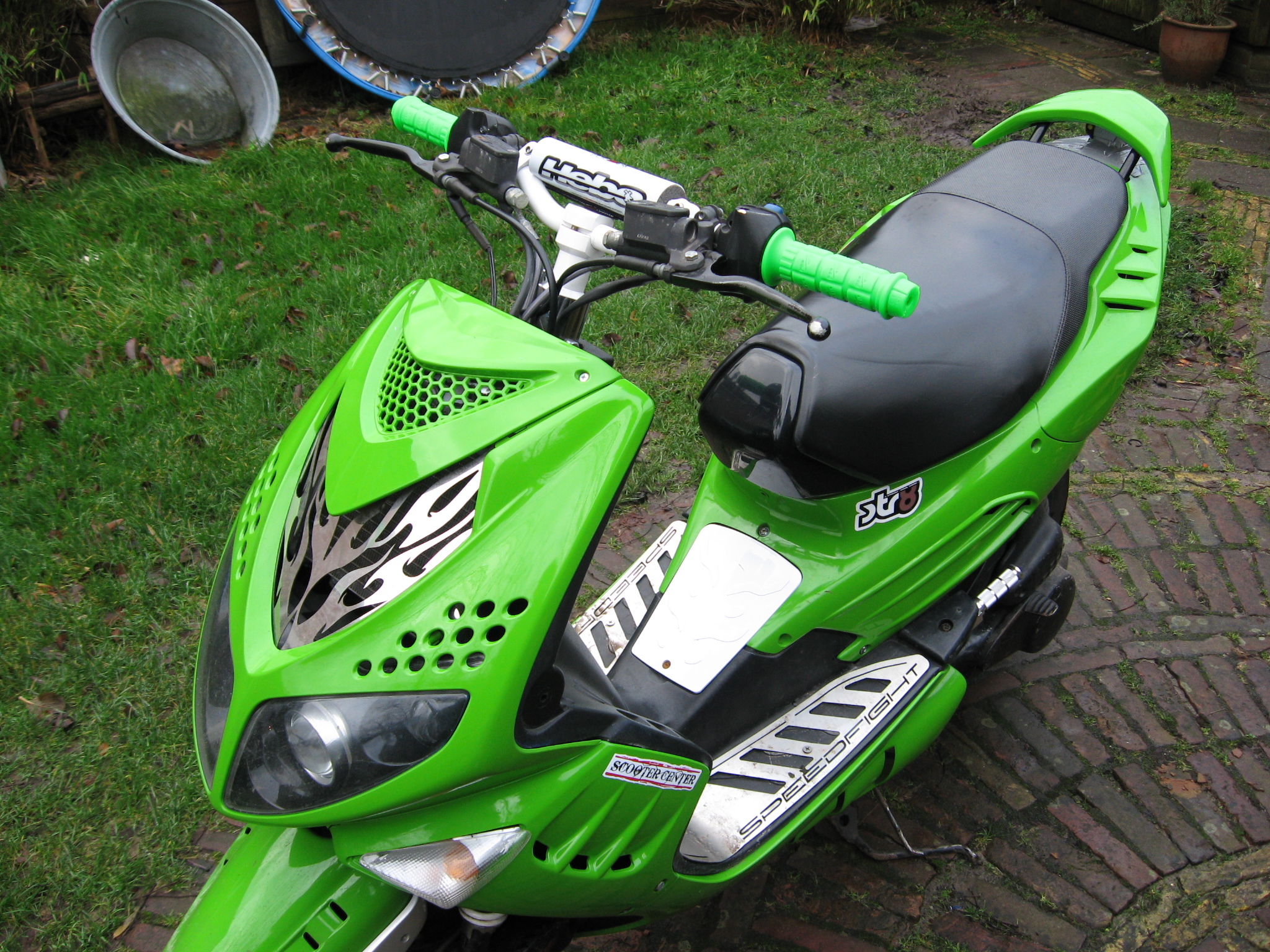 Dit was dus mijn eerste scooter een Speedfight 2. Later kawasaki groene kappen erop gezet en racestuurtje. Hij reed 85-90 tot dat me hele cilinder naar de klote ging + krukas :'(