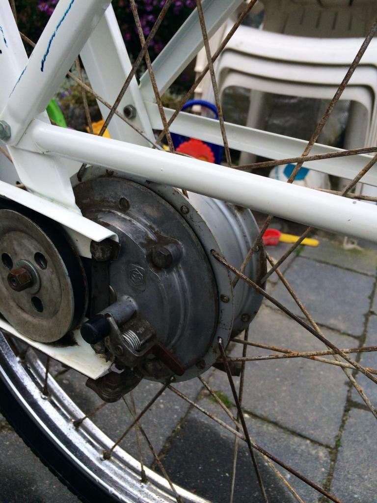 Ben er alleen niet uit of de kleur origineel is,er komen rode en groene en gele verf kleuren doorheen…Binnenkort de spaken en blok maar eens schoon maken:D De cranks en tandwiel heb ik ook schoon! Wat een werk… Als het goed is heeft een forum genoot wat onderdelen voor me.