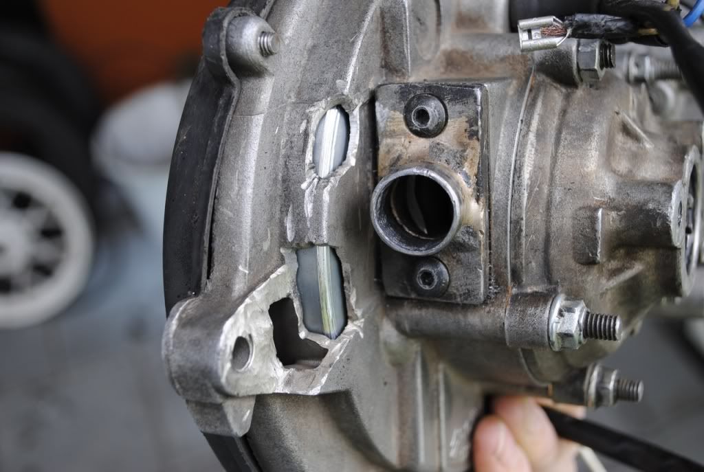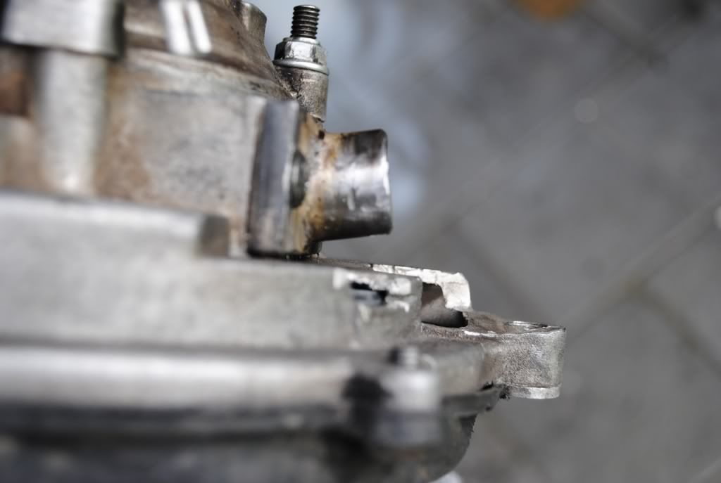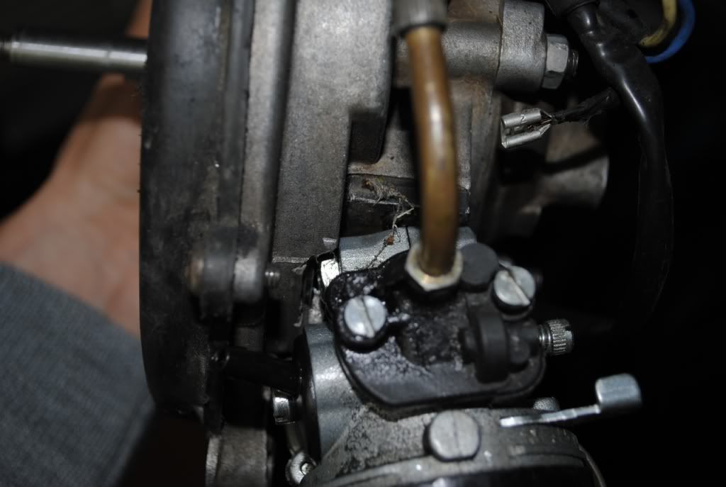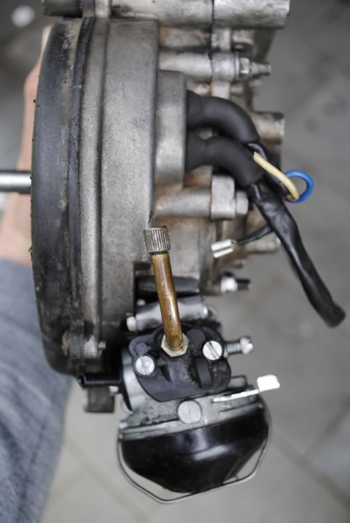 De de stelschroef zit aan de verkeerde kant waardoor het bijna onmogelijk is om hem af te stellen omdat het carter in de weg zit.De carb op het blok zetten en dan in de brug is geen optie, de carb zit in de weg bij het er in zetten.