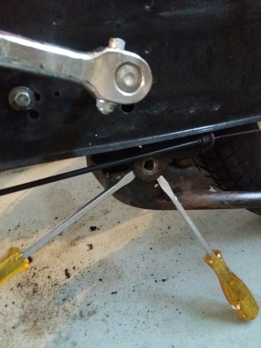 Dit is het schroefje met het veertje er achter dat naast je benzine aansluiting zit op je carburateur.Wat ook kan is dat de koppelingsveertjes uitgelubberd zijn en je koppeling dus eigenlijk altijd aangrijpt.