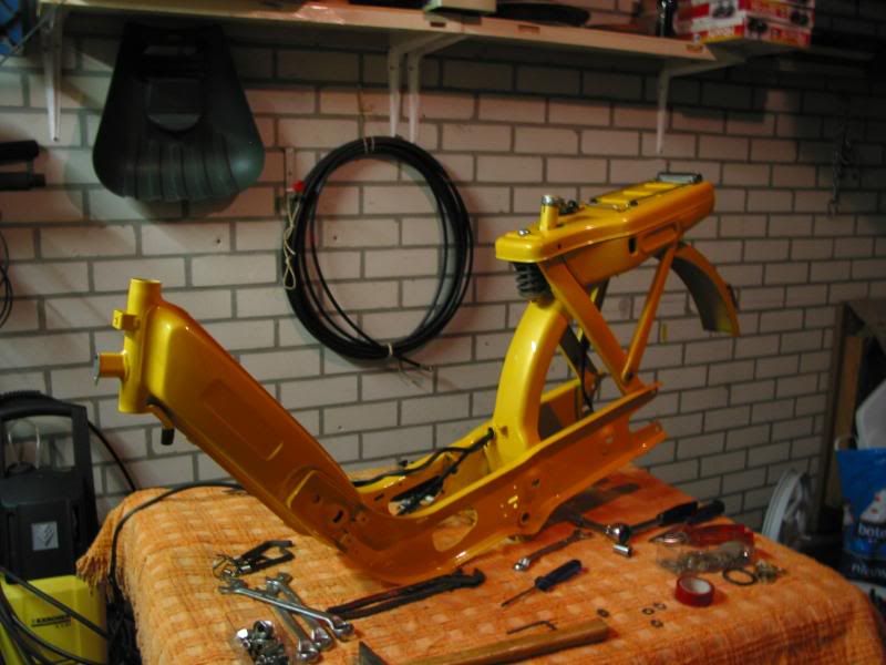 En een kleine tip: zet eerst je voorvering in je vork, en dan pas de vork in het frame. Scheelt een hoop ellende, want het is een rotklusje.