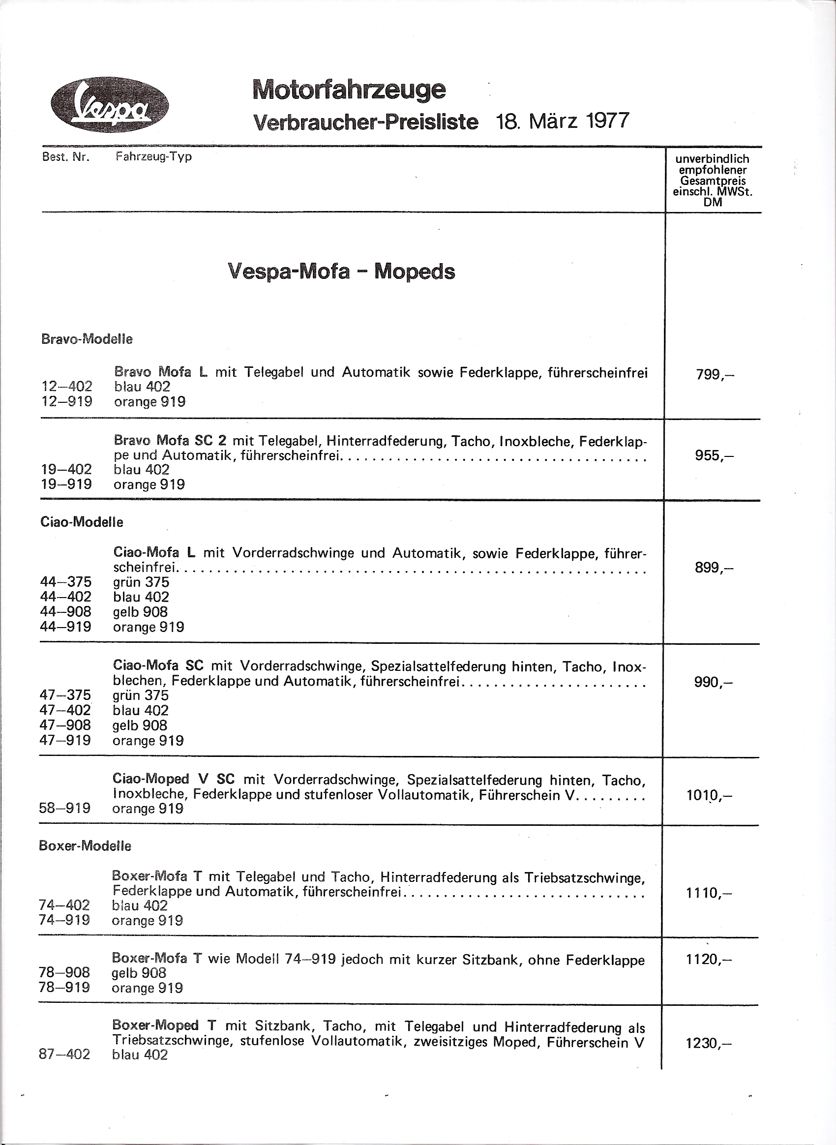 here is a Preis List from 1977
