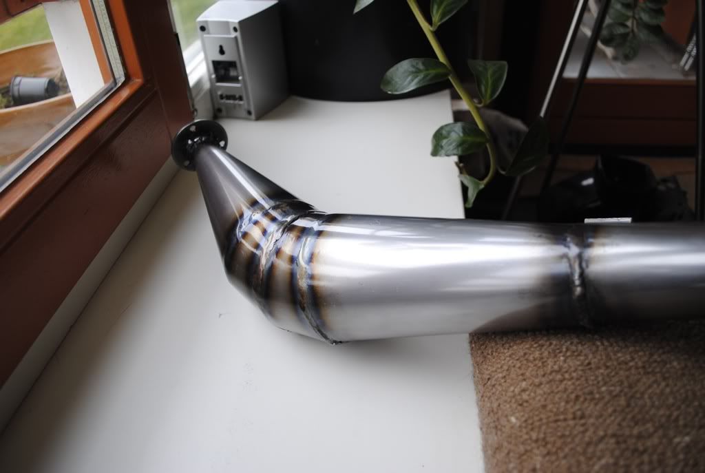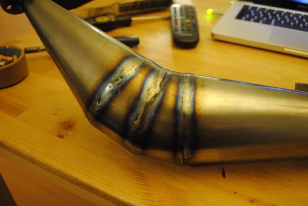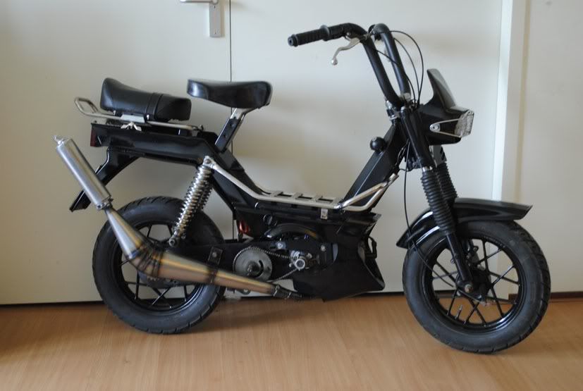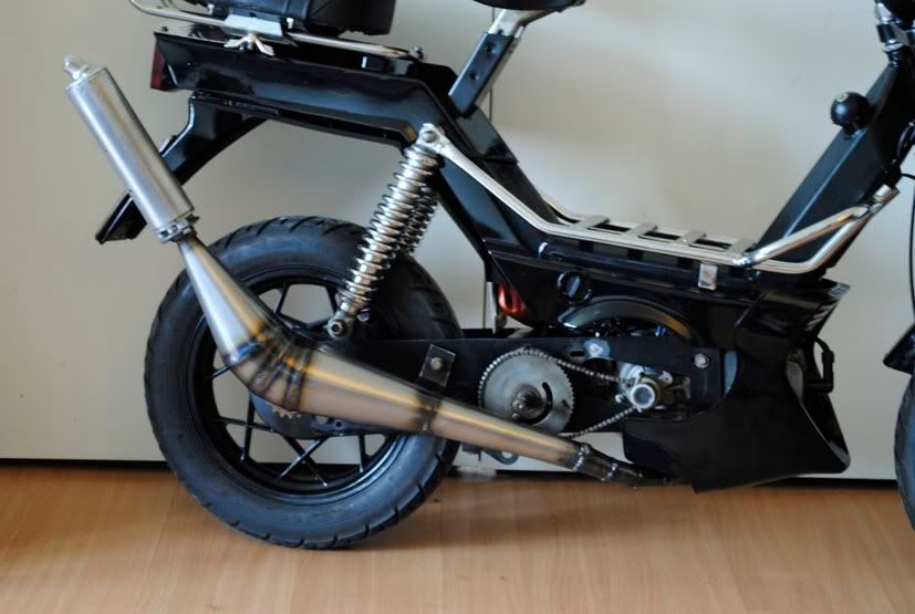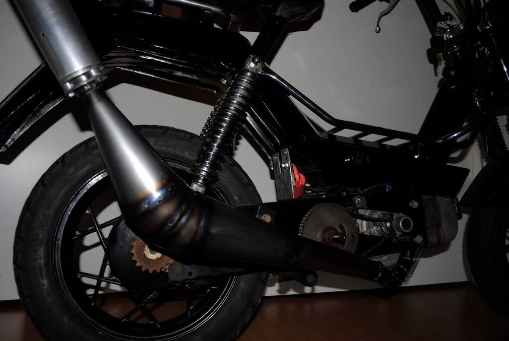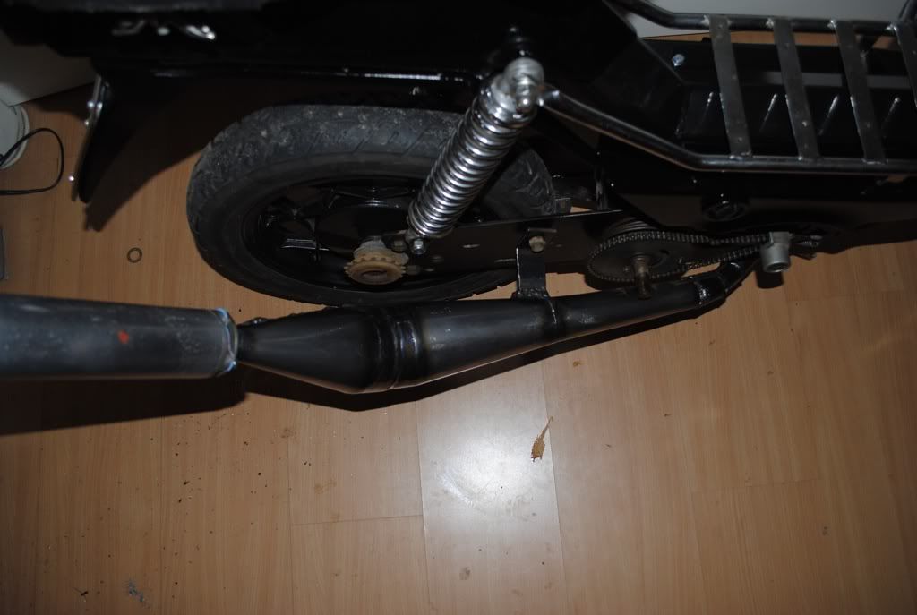 De uitlaat staat veel te hoog maar het ophangpunt en de voorbocht moeten nog aangepast worden zodat hij mooi zit.