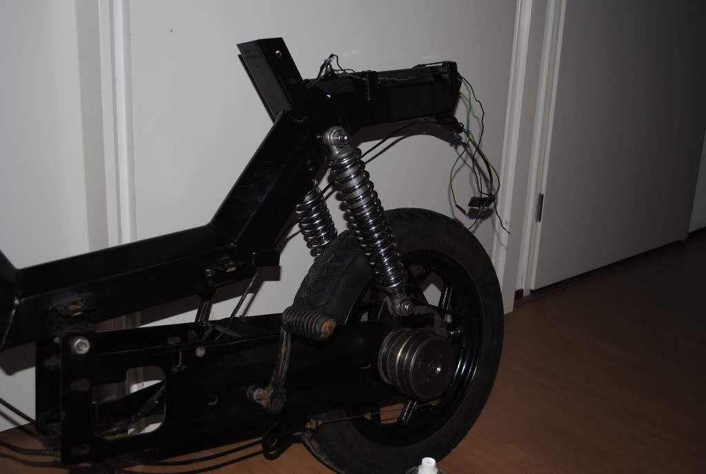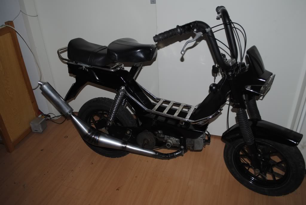 De uitlaat staat te ver van de brommer af, het ophangpunt en de voorbocht moeten aangepast wordenEn de vario waggelt een beetje, alsof de kruk krom is, wat mij sterk lijkt want die kruk komt nieuw bij JMPB weg.