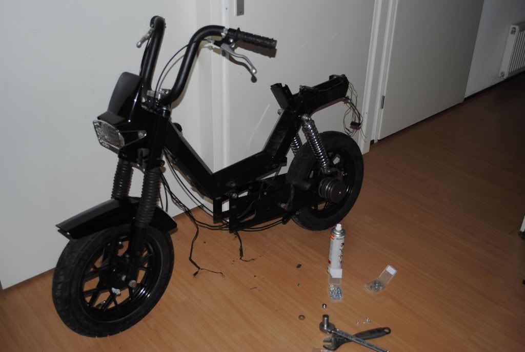 De brommer is schoon en ik ben hem in elkaar aan het zetten.
