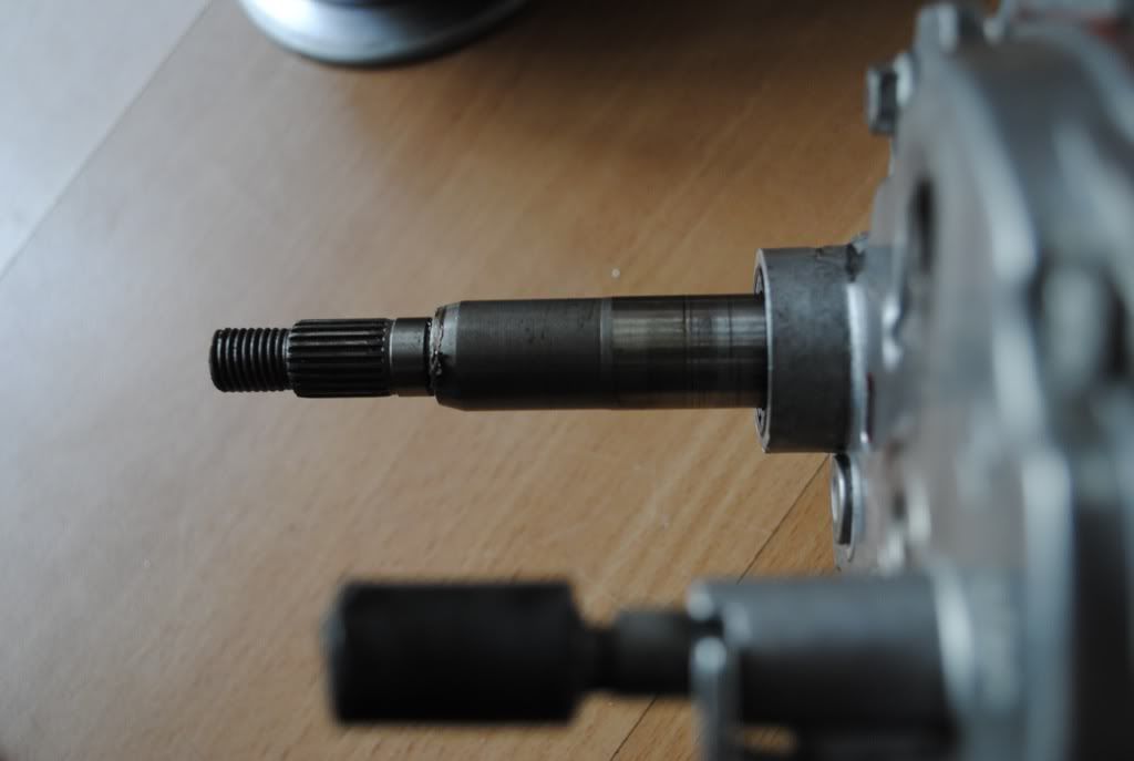 De snor as is afgedraaid en er is een lange pin overgehouden met aan het einde schroefdraad, die is in de Fox as geperst, geschroefd en met loctite vastgezet.