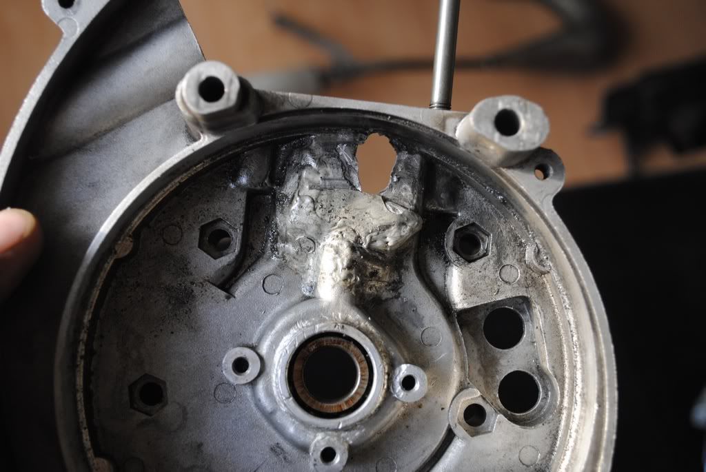 ik zou een soort van klein aluminium plaatje pas maken en deze er in proberen vast te solderen.Dikke pech heb je ook weer. jammer dit,maar misschien is het een optie om een nieuw carter (of 2e hands) te bestellen en dan het het kickstart carterdeel wel weer te gebruiken?