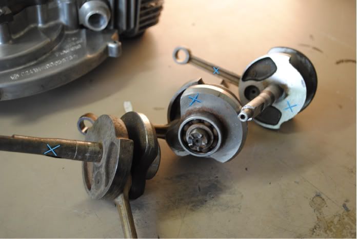 De kickkrukas wordt samengesteld uit de componenten van 3 krukassen, degene waar een blauw kruisje op staat.