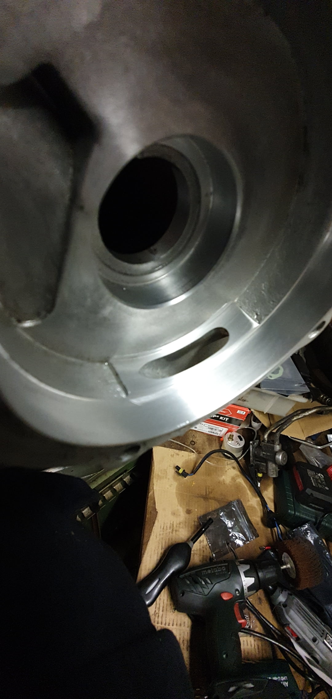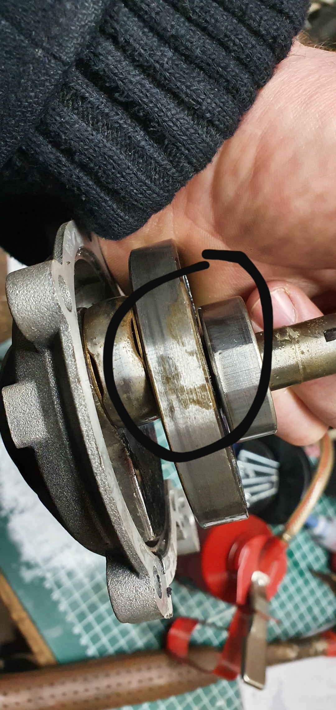 Paar plaatjes ter verduidelijking. Het betreft een nieuwe mazuchelli krukas trouwens. Het probleem is opgelost door de braampjes weg te halen met een schuurschijfje welke in de fotos staat.