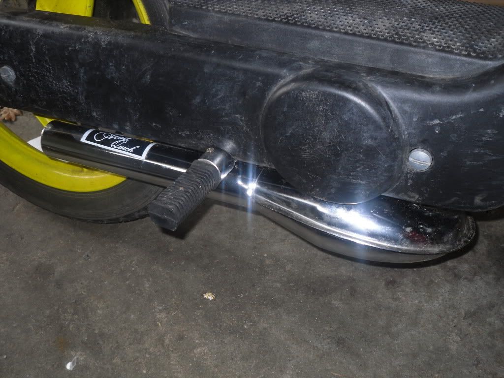 Dus, ik weer tevreden, mooi rijden, maar toch noch te langzaam. Als laatste had ik er dus een 13/13 dellortho carb. op gezet samen met een malossi powerfilter en groene trekveren van polini:) Zoals je misschien in een post heb kunnen zien was ik dus zo dom om mijn koppelingsmoer niet goed vast te draaien en te borgen en dus ook vloog mijn koppeling eraf. Gelukkig heb ik deze een dag later nieuw gekocht en meteen vervangen, en daarbij kreeg ik voor 15 euro ook nog eens dit bling bling uitlaatje erbij:) Een Alsil quich, mooi chroom en rijd heerlijk.