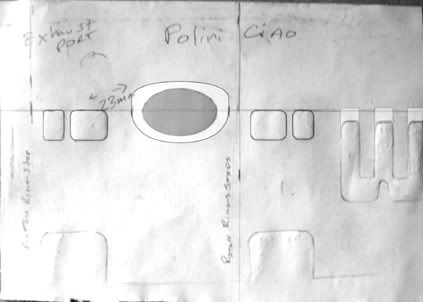 Thanks for the comments! The bike is a 1980 Vespa Si and it does have the stock monoshock that came with it. The custom intake was a lot of fun to put together, but installing it in the subframe required considerable cutting. A aluminum support strut has been installed to provide proper rigidity. I’m using a 63cc Polini Cylinder which has been ported and modified. Currently, the performance is very poor. The carburetor -a Tillotson HL360- is designed for 80-100cc Karts and needs to be adjusted for jetting and proper fuel pumping. Additionally, I’m using 17″ wheels along with the Malossi overdrive gear set, so the bike has very bad acceleration. The Polini Cup class I race has an ‘open’ qualification, so you can run any cylinder under 90cc’s on any moped, provided it originally had pedals and no manual shift. Currently, Honda Hobbit/Caminos and Derbis are the fastest machines, but the Vespas aren’t far behind. I have until April to get Plan B up to race speed. Here is the current port map: