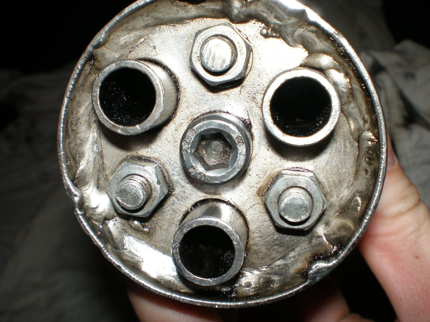 Verstelbare demper, heb ik ook een keer aan gedacht maar dan anders, middelste inbusbout draai je rechtsom en de 3 pijpjes komen naar buiten, draai je linksom dan verdwijnen ze weer, dus de pijpjes kun je verstellen of tegen een schot aan of ver van het schot af voor een meer open uitlaat.